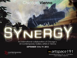 On September 13, 2012 a group exhibition by 33 Contemporary Gallery artists opens in the city of Vienna, Austria. The exhibition titled SYNERGY features a variety of woks on paper at 11 x 14 inches in size each. Synergy is defined as the interaction or cooperation of two or more organizations, substances, or other agents to produce a combined effect greater than the sum of their separate effects. For the last three years Vienna and Chicago have been systematically collaborating through artists Petrnilla Hohenwarter (Vienna) and Sergio Gomez (Chicago). Their personal collaboration resulted in a larger project for Synergy. Each participating artist was asked to create a work of art around the exhibition’s title. The works reflect the spirit of enthusiasm, collaboration, force, energy as they embody the spirit of freedom.