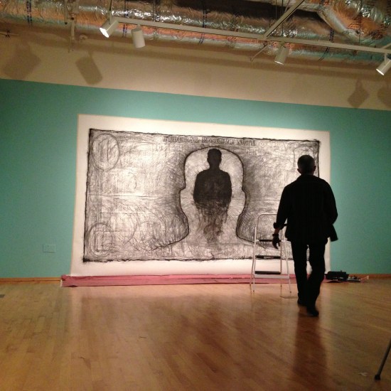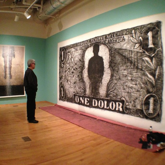 This week, I had the chance to do my largest charcoal drawing at the National Museum of Mexican Art in Chicago as part of my solo exhibition titled Open Doors/Puertas Abiertas. The work took 5 hours split in two day sessions. The drawing is 100″ x 176″ on stonehenge printmaking paper. The idea came about as I was driving to the museum for the drawing. I had a One Dollar bill inside my cup holder. I saw it and I thought about what that piece of paper means specially to an immigrant. The dollar bill has been a powerful symbol for many generations. So, I changed the word “dollar” to “dolor” which means “pain” in Spanish. There is pain for every dollar. Who’s pain? That is for you to decide…