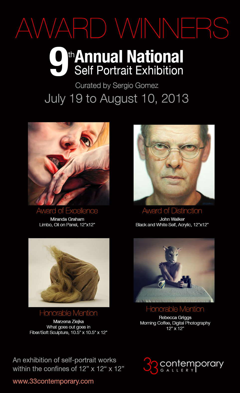 The exhibition’s submission page received over 180 works in all media. The final selection included 67 works including photography, drawing, print-making, digital, sculpture, mixed, collage, performance and video. The 9th Annual Self Portrait Exhibition runs from July 19 to August 10, 2013. It can also be visited online at http://www.33contemporary.com/9thPortraitShow/index.html.