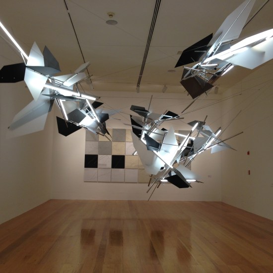 Utilizing fluorescent light, Thomas Glassford recreates a giant start floating in the middle of one of the gallery rooms. The contrast of bright radiating light against the deep blue walls invites the viewer to walk towards the sculpture just like flies are attracted to a fly light trap. There is something about the presence of light that makes us interested to it. Once inside the gallery space, one has a sense of being at the birth of a cosmic star somewhere in the universe. Perhaps, one could also feel as if the luminous start is a microscopic atomic nucleus. It is in such mixed of perceptions and illusions that Mesocosmos challenges the viewer’s understanding of our very own concept of placement within the context of an expansive universe.