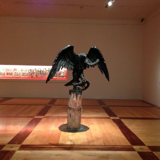 At the entrance of the exhibition, one is welcomed by Marcos Castro whose works explore the imagery of the eagle devouring the serpent. A Mexican mystic symbol of the settlement of the Aztecs in now Mexico City. Castro examines conceptual representations of such account via sculpture, drawing and tile installation.