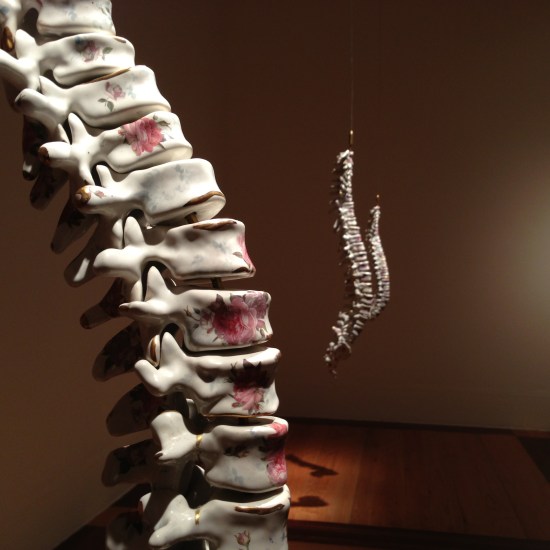 All the artists in this exhibition are conceptualists and their works are the result of studies, investigation and exploration. In Maria Garcia Ibañez’ beautiful artifacts and installations, one discovers a pristine archeological site merging the old and the new within the confines of the gallery space. Utilizing ceramic medium, the artist recreates single bones and bone structures such as the back column. With precision, neatness and impeccable finish, Garcia Ibañez decorates the vertebrae of three adult back columns floating in space. The ceramic vertebrae painted with flowers and spots of gold command presence and invite to close inspection. Inviting the viewer to come up with his/her own visual dissection, Garcia Ibañez investigates the mysticism of death, life and the perception of both. This exploration is reaffirmed by a series of highly detailed drawings of organic forms, bones and flowers. The flowers then, become a highly charged symbolic element that under Garcia Ibañez creates a parallel line of the celebration of life and the reminder of death. It is in such dichotomy of elements that one is presented with alternative understandings to otherwise ordinary cultural elements.
