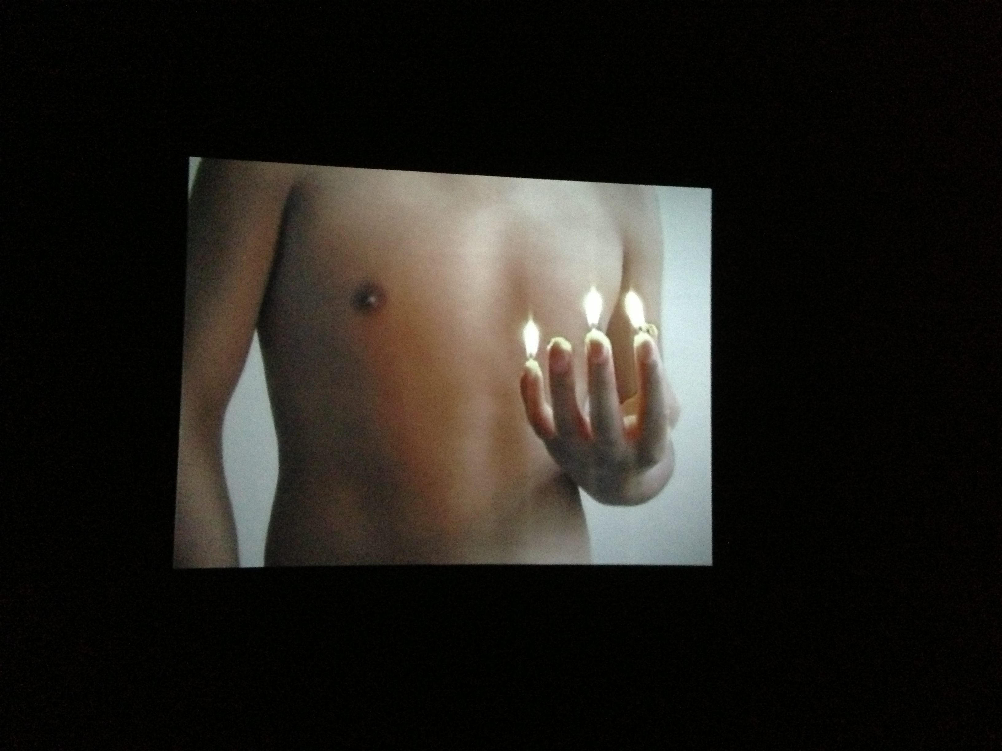 In terms of video work, Antonio Pacuar features a short film of a young man whose identity is hidden by the camera’s focus on his upper torso eliminating the head and lower body. In this work, the male figure acts as a sort of self appointed altar, shrine or mystic figure by slowly lighting up each finger with a small flame. Each finger has its tip covered with a wick and wax acting as living candles. The flame slowly is initiated and passed on one finger at a time to be then terminated by the other hand pressing slowly on each wick. Such repetitious work provides a visual avenue of interpretations related to the role of ritual, supplication, religion and mystical experience in Latin American cultures where the heavy use of candles is associated with ideas of intercession, transcendence and death.