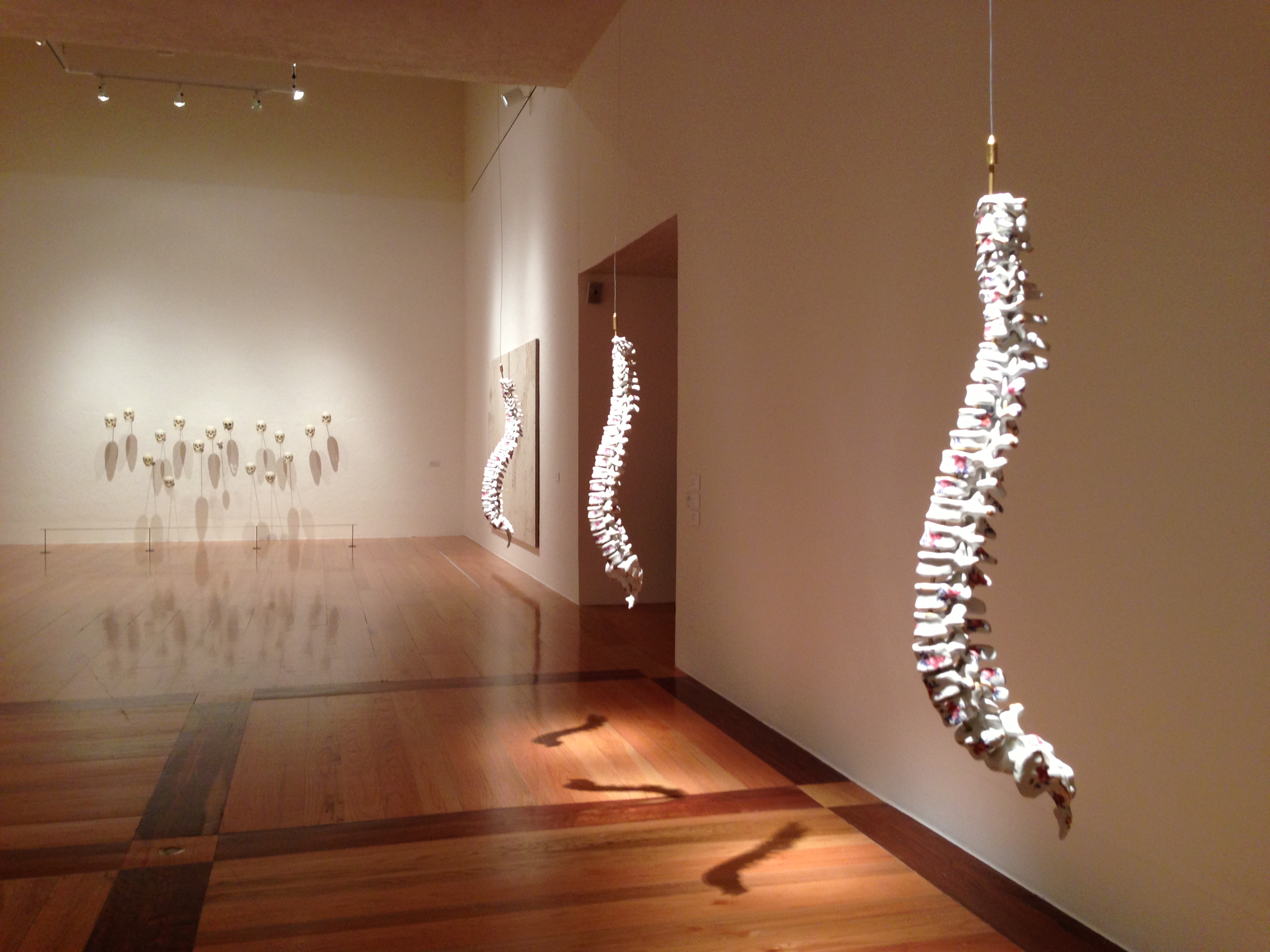 All the artists in this exhibition are conceptualists and their works are the result of studies, investigation and exploration. In Maria Garcia Ibañez’ beautiful artifacts and installations, one discovers a pristine archeological site merging the old and the new within the confines of the gallery space. Utilizing ceramic medium, the artist recreates single bones and bone structures such as the back column. With precision, neatness and impeccable finish, Garcia Ibañez decorates the vertebrae of three adult back columns floating in space. The ceramic vertebrae painted with flowers and spots of gold command presence and invite to close inspection. Inviting the viewer to come up with his/her own visual dissection, Garcia Ibañez investigates the mysticism of death, life and the perception of both. This exploration is reaffirmed by a series of highly detailed drawings of organic forms, bones and flowers. The flowers then, become a highly charged symbolic element that under Garcia Ibañez creates a parallel line of the celebration of life and the reminder of death. It is in such dichotomy of elements that one is presented with alternative understandings to otherwise ordinary cultural elements.