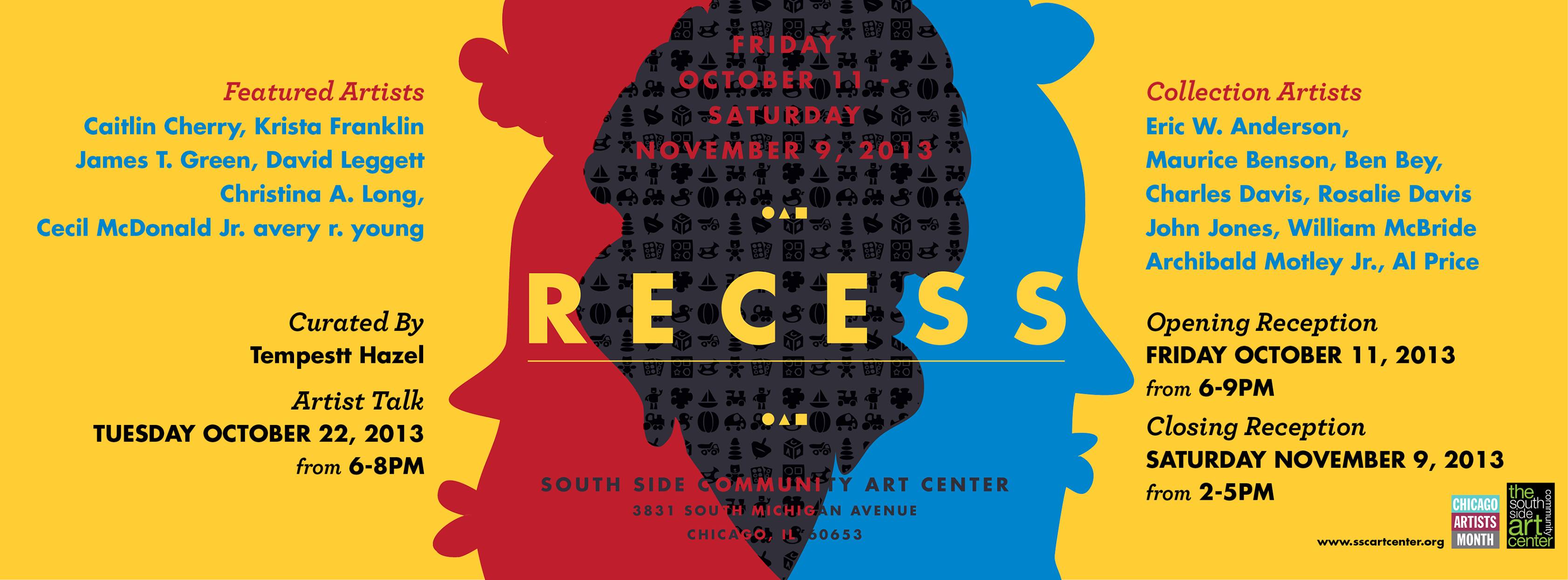 Recess is a group exhibition that uses images associated with youth and play to provide a much needed respite from the weight of everyday reality. Bringing together contemporary artists working across mediums with artists from the South Side Community Art Center’s permanent collection, these works create a space that provokes the act of daydreaming and encourages one to tap into the recesses of the imagination in order to create new mythologies, narratives and images that are unencumbered by those often tethered to the Black experience.