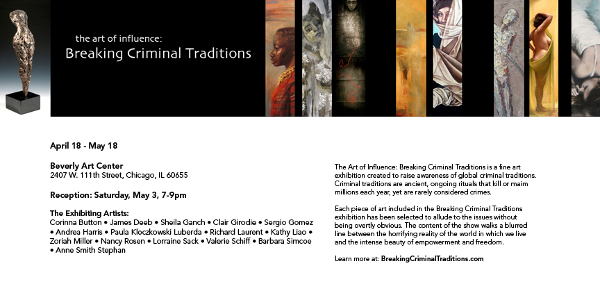 The Art of Influence: Breaking Criminal Traditions is a fine art exhibition created to raise awareness of global criminal traditions. Criminal traditions are ancient, ongoing rituals that kill or maim millions each year, yet are rarely considered crimes. They include honor killing, child marriage,acid attacks, bride burning and more. Each piece of art included in the Breaking Criminal Traditions exhibition-has been selected to allude to the issues without being overtly obvious. The content of the show walks a blurred line between the horrifying reality of the world in which we live and the intense beauty of empowerment and freedom. In creating awareness and beginning a dialogue, we can support those affected by encouraging change-change that can only come from within each culture.
