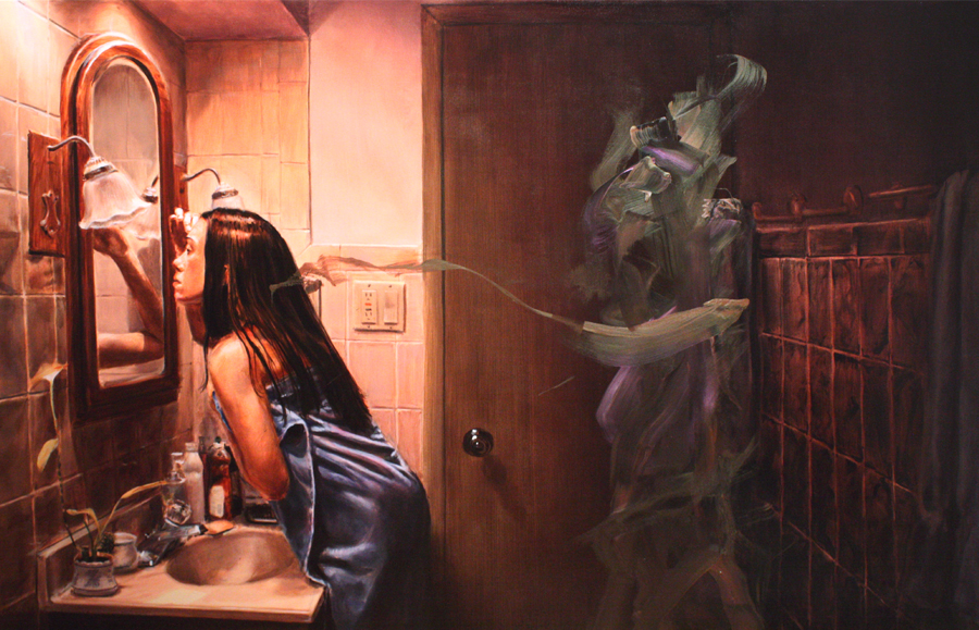 As I entered the gallery, I found myself between two powerful life-size paintings created by Jennifer Cronin. I could not help myself but to think about what Sigmund and Anna Freud would refer to as “projection” (i.e., defense mechanism). Is Cronin challenging each viewer to identify something about the self that may be causing some psyche pain? As I sat between Jennifer Cronin’s Untiled (Self Portrait, 2008) and Untiled (Self-Portrait 2, 2008), these paintings reminded me of the internal battles taking place as we pursue self-confidence and fulfillment. As I looked at Self-Portrait 2, I noticed a confident woman who appears to have full control of her life. She is sensual, delicate, feminine and is showing to the world how confident she feels about herself, her appearance, her body. She is letting us know clearly and loudly: “I am in control!” But, what happened to this confident woman in Self-Portrait 1? The artist warns us that this facade can only last so long. At the end of the day, when no one else is around and no one is looking, the real self becomes evident in the darkness of the night. Conflicted, alone, distressed, confused. Exhausted from impressing others and showing the unreal self.