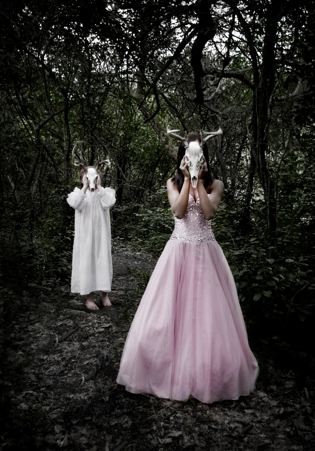Through deer skulls, Moore hides the real self of her characters as they become afraid of exposing themselves, their story, and their intentions in an effort to avoid pain, embarrassment or rejection (Untitled (with deer skulls), 2012; Untitled (sun shining through skull, dress and trees). Despite the chaos surrounding many of Moore’s works, she does not discard hope. In Untitled (in fog), 2013 and Untitled (with nest), 2013, the artist encourages us to search for ‘that place’ where one can find inner peace, experience mental rest and restore one’s balance.