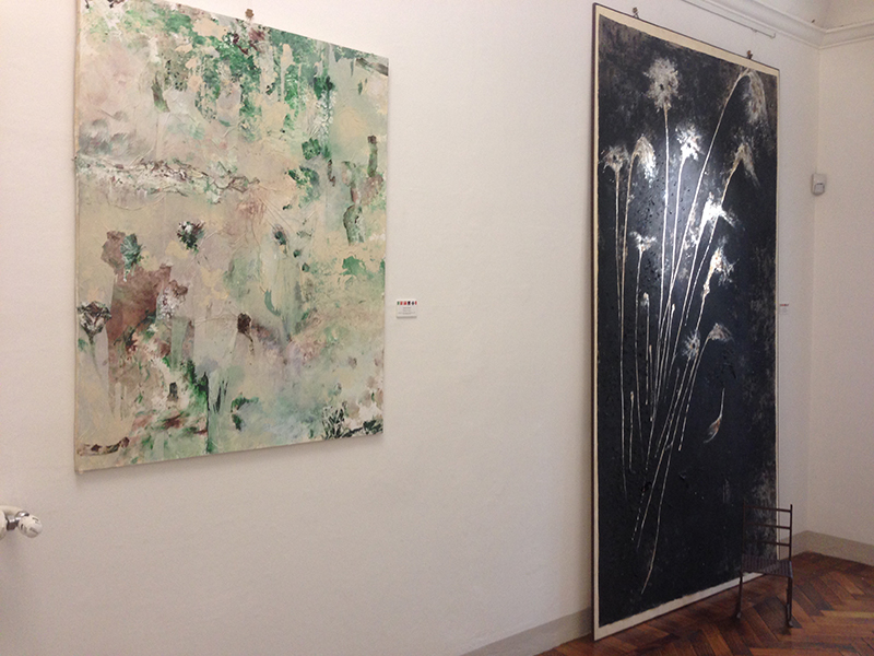 Following Oh’s exhibit, Milan based artist Brigitta Rossetti presented a solo project titled “Children’s Garden” which included three mixed media works on canvas. Two of which measured approximately eight feet in height and included two small child-size chairs as part of their installation. An additional painting and a small three-dimensional work were also included in her solo presentation. Rossetti’s work evoked nature as its main protagonist while touching on the sensibility of our existential reality. The expressive qualities and the spontaneity of the work provided a sense of intimate personhood while the absence of any figurative forms, reminded us of it’s existence. Particularly, the small child-size chairs in front of the large scale works created a strong visual and conceptual contrast between our present reality and our lost childhood memories.