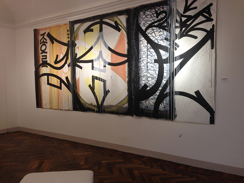 In the last gallery leading from the main corridor, Chicago-based artist Mario Gonzalez Jr presented a solo project titled “Grafitto.” Gonzalez’s letter forms abstraction paintings, varying in size from small 8×10 inch panels to a large scale mural size work, surrounded the gallery with a visually playful urban feel. Despite that the letter forms in Gonzalez’s work are derived from his experience as graffiti writer, they take on a refined form in his recent works. Not to be confined to street art, these paintings embody an expressive and modern simplified abstraction austere of chaotic compositions. Instead, Gonzalez’s fast paced brushstroke masterfully lands in its proper place providing a monochromatic composition that is layered and varied while retaining a sense of balance and visual unity.
