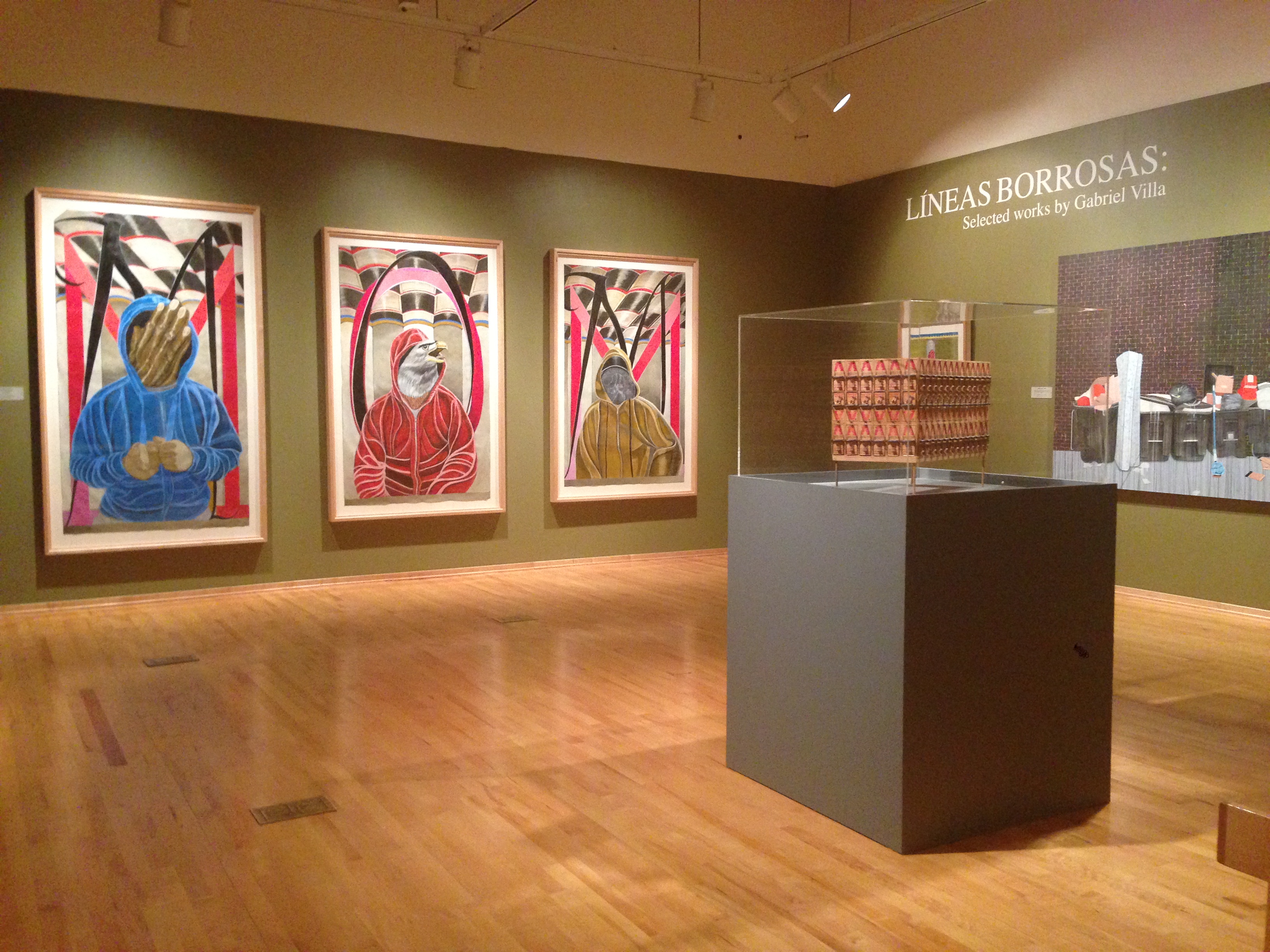 The exhibition Lineas Borrosas by Chicago artist Gabriel Villa opened this summer at the National Museum of Mexican Art in Chicago. Curated by Cesareo Moreno and Ricardo Serment, the exhibition, which translates as “Blurred Lines”, explores the many issues that are confront many of our inner city communities including the one surrounding the National Museum of Mexican Art. Some of these issues include identity, social justice, religion, poverty and public safety. Villa was born in El Paso, Texas and grew up seeing firsthand the injustice and the harsh issues of the US/Mexico border. After moving to Chicago, such impression continued to attract him to the social realities of Chicago’s Pilsen community. The exhibition takes stage in the heart of a migrant bi-cultural community where the American dream sometimes feels to be a distant reality. A piece of “El Barrio” comes together in the hands of Gabriel Villa as a straight forward commentary on social and political issues that are often kept hidden from public view or become propaganda during political campaigns.