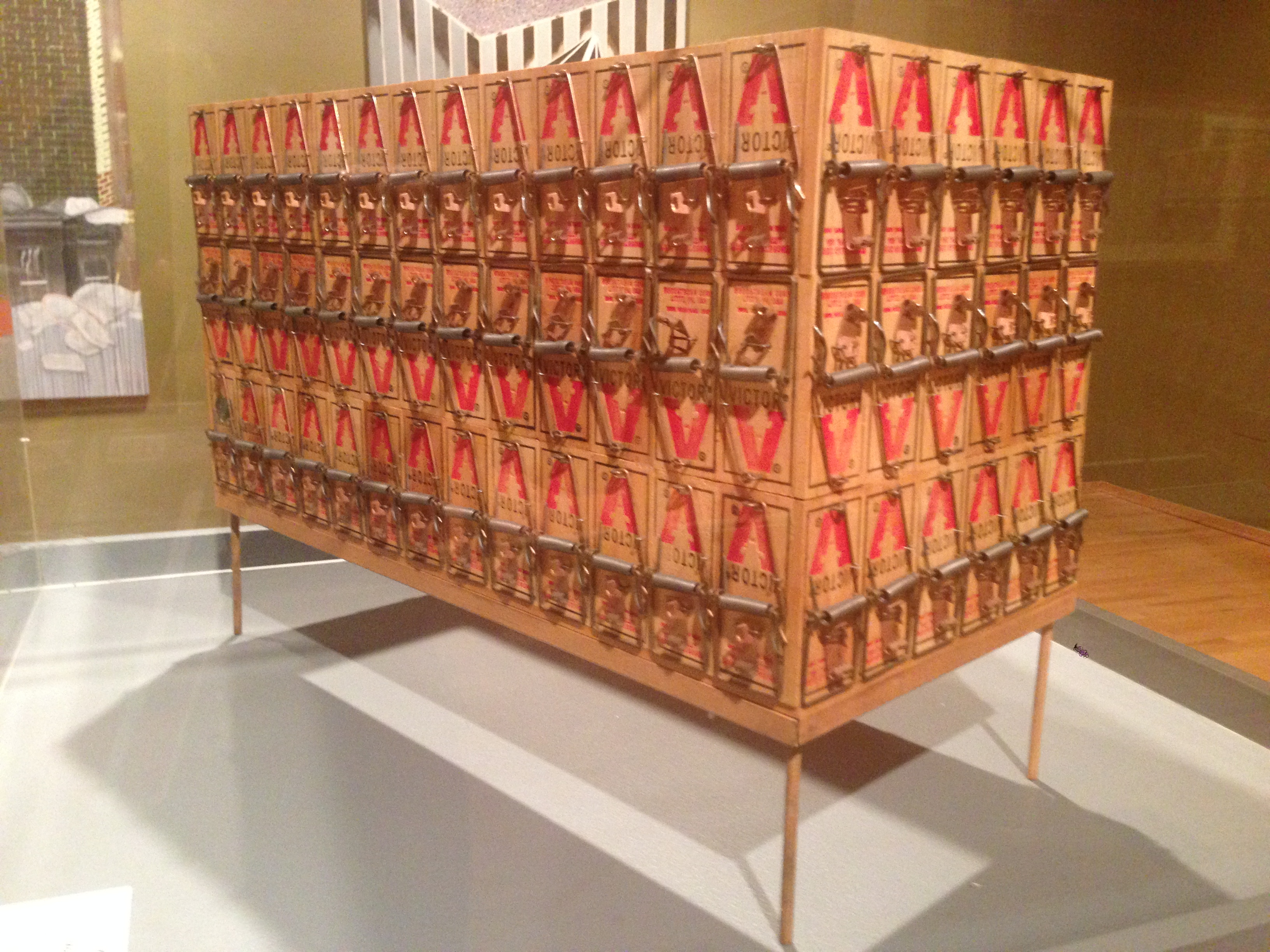The symbolic image of hands as supplication also takes root in the Latin American experience with Catholicism and its new interpretations under migrant movements in the United States. In works such as “Mouse Trap,” a three-dimensional structure resembling a building appears to be aesthetically beautiful as seen from a distance. At close inspection, one finds the external façade completely covered with ordinary mice traps. The juxtaposition of the beautiful with the mundane and repulsive enriches Villa’s interpretation of the social ills of our own communities and reflects on the underlying truths beneath the veneer of outward appearance.