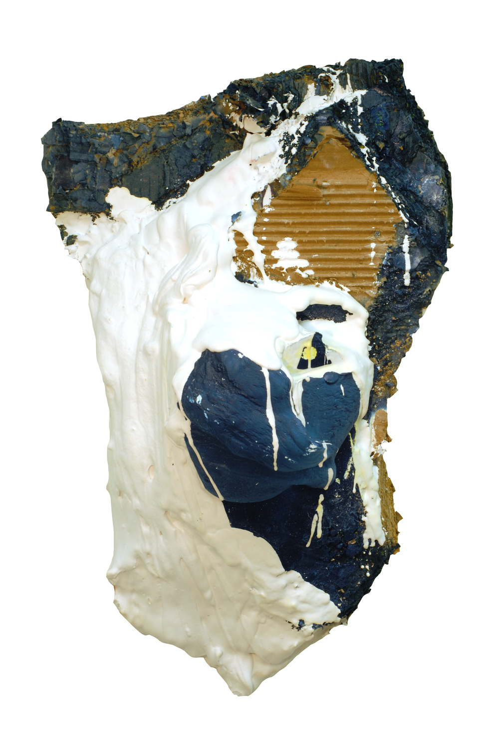 A typical work in this exhibition is constructed of layer upon layer of cardboard sheets glued together to make a larger mass. In turn, the cardboard mass gets carved out, burned, and painted to an abstract three-dimensional shape that hangs from the wall. The result is a beautiful sculptural work with rich surface that entices the eye of the viewer to believe it may be something other than discarded cardboard. Luis work reflects a vigorous studio process which begins in material gathering of objects such as wood, cardboard, canvas, nails, newspaper, etc and ends in a formal investigation of the forms he produces in the act of deconstruction. Using power tools, he devours material to create works of various sizes and complexities. “My motive for creating art is curiosity. I am a very tactile person and I love to play and experiment with any medium I can get my hands on. Various materials attract me and they stimulate excitement that triggers my art making. So I receive my inspiration through connections with particular material.” comments Luis when asked about his inspiration for such works.