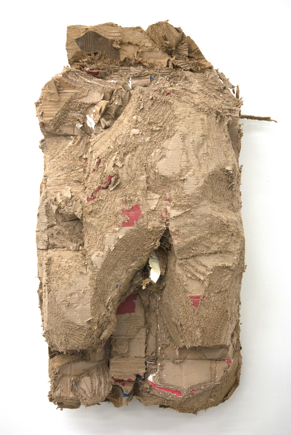 Indeed, the result of his investigation reveals an intriguing mind. One that in the early days relied on representation and his natural ability for drawing. In those early works, the mixture of street and fine art were specifically rooted in his upbringing and contextual understanding of his culture. In contrast, his current non-representational work establishes a departure for the artist. The work ceases to be rooted in a particular midwestern community and projects a much larger universality and context. These sculptural works don’t need recognizable imagery for their existence. In fact, the absence of any graphic image makes them more interesting as objects and material. They are simultaneously raw but sophisticated. The cardboard boxes which ultimately protect the intercontinental goods we consume on a daily basis, become the immediate object of Luis’s desire. The cardboard material, which we recognize as a flat-lightweighted object, reveals itself as a volumetric mass.