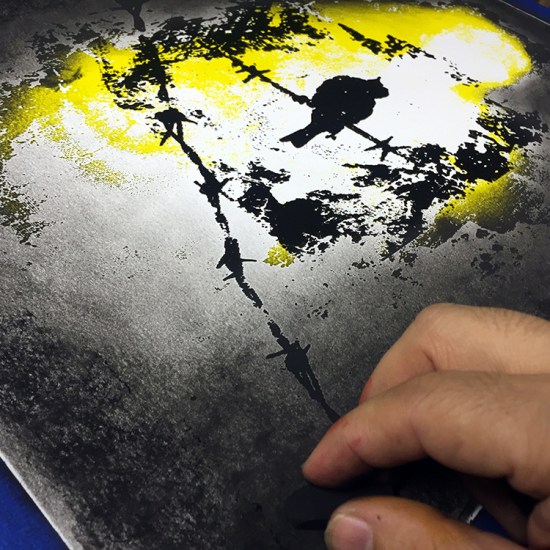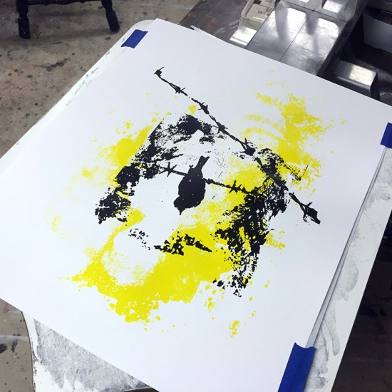 Flight to Paradise celebrates the first step towards a cleaner future. The Paris Pact which aims to curb global warming to less than 2C (3.6F) by the end of the century was signed by nearly 200 countries in December 2015. “I believe this moment can be a turning point for the world,” President Obama said in a press conference, and called the agreement “the best chance we have to save the one planet that we’ve got.” Flight to Paradise reveals, under a cloud of smoke, a bird standing on a barb wire waiting to take flight. The silohuette of a man in bright color yellow represents the power we have to change the world. A stained and polluted world has become our legacy. Unless we take action, the cloud of smoke will close upon us to a point of no return.