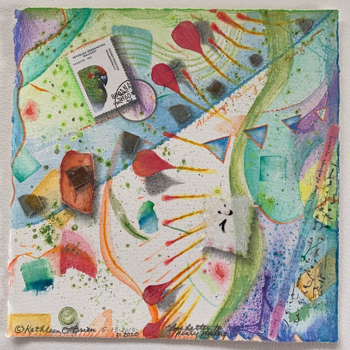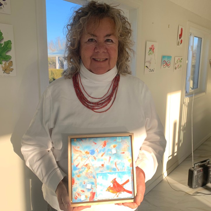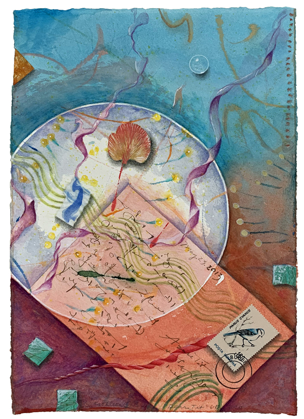 I combine abstract watercolor, drawing and botanicals into collages that appear dimensional. The subject reflects positive aspects of nature as witnessed by the present moment and the cycles of the seasons and time of life.