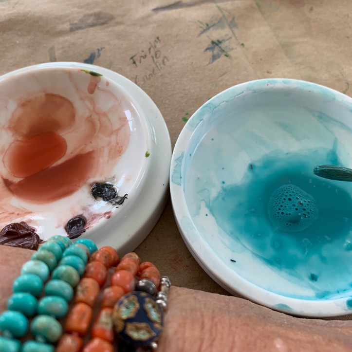 After morning meditation, coffee, walk and chores around home and garden, I paint or create until noon when I break my fast. I eat and take a siesta, then return to the studio. This includes checking emails and social media. I work until 5, when I cook, talk to the kids & grandkids, friends and husband. Structure and discipline work for me, though I throw in a dose of doing nothing and spontaneity occasionally.