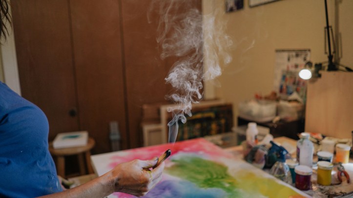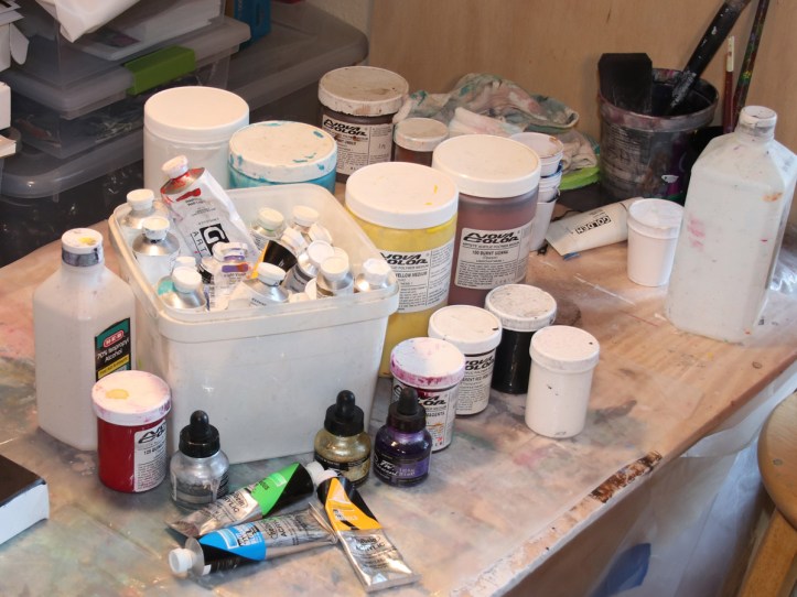 Since I transmit energy on to my paintings it’s hard to just go and paint. I feel I need to be in the true creative flow. Sometimes just allowing myself to “play” with materials helps. When I am ready to paint I smudge the studio and the materials I will be working with before I start a painting. I also work on numerous pieces at one time. When my inspiration comes, it’s like a portal has opened up.